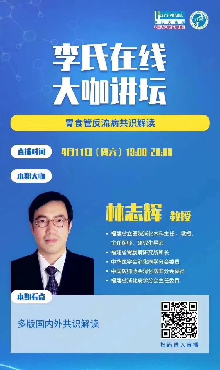 4月11日(周六)19:00-20:00 ,李氏大药厂特邀请福建省立医院消化内科主任、教授、主任医师、研究生导师;福建省胃肠病研究所所长;中华医学会消化病学分会委员;中国医师协会消化医师分会委员;福建省消化病学分会主任委员林志辉教授开展专题讲座:胃食管反流病共识解读。欢迎各位老师在线观看,共享学术盛宴!